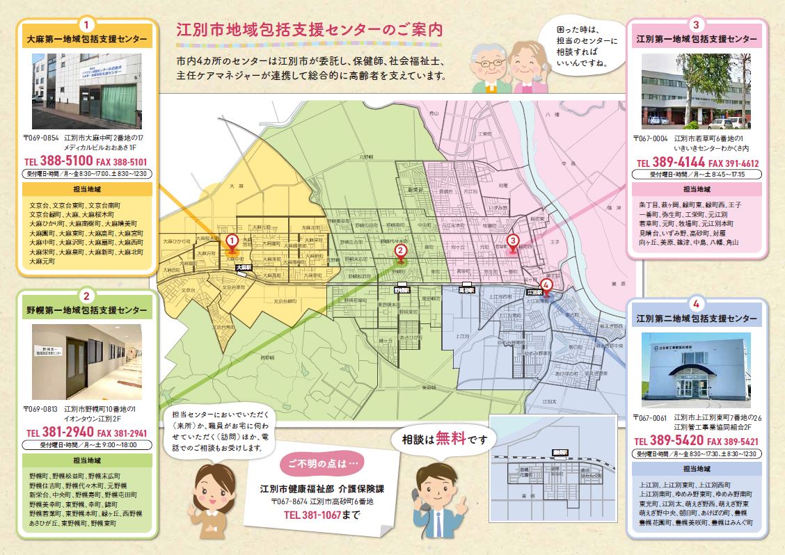 各地域包括支援センターの担当地域については、江別市地域包括支援センターのご案内 [その他のファイル/211KB]をご覧ください。