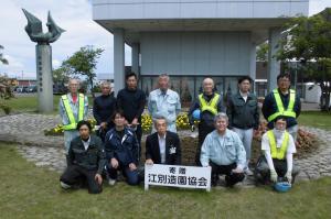 江別造園協会は、地域貢献活動として昭和63年から毎年、30年以上にわたって、市庁舎前庭の花壇整備を行っています。