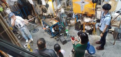 この日、参加した小学生4名は、ガラス工芸作家 柿崎 均 氏に習いながら、コップの形、色、模様選びや、熱せられたガラスの形を整えたり、コップの底をつける作業などを行いました。参加した子どもたちは、1,000℃以上もある熱いガラスの扱いに緊張しながらも、真剣に自分だけのコップ製作に取り組んでいました。