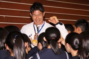 陸上競技を始めるきっかけとなった、大麻東中学校では、激励の花束と拍手で歓迎された。右代選手は生徒たちに、「夢をかなえるため『努力をし続けること』、『失敗してもあきらめないこと』が夢をかなえるために必要、これから大人になっていくみんなも辛いことがあっても、夢に向かって一緒に頑張りましょう」とメッセージを送った。たくさんの元気な子どもたちとの交流に、右代選手も「子どもたちから力をもらいました」と笑顔だった。