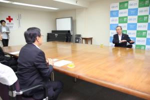 江別管工事業協同組合の龍田代表理事は「水道インフラの被害は甚大で、今も水が出ない地区があります。早く通常の状態に戻ることを願っています」と話し、三好市長は「浄水場が破壊されたところもあると聞きます。日赤の江別市地区長として、いち早く支援をという思いに感謝します」と感謝を述べました。