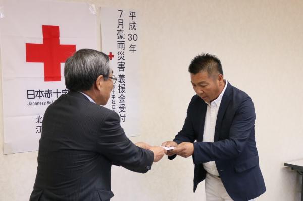 7月24日(火曜日)、えべつ花火実行委員会(椿坂実行委員長)が、来場者から寄せられた平成30年7月豪雨災害への義援金20,987円を日本赤十字社北海道支部江別市副地区長の佐々木雄二副市長に手渡しました。