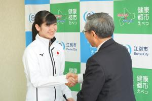 大会に向け、田畑さんは「自分に関わってくれた全ての人に結果で恩返ししたい。目標は金メダル」と意気込みを語り、佐々木雄二副市長は「江別市からカーリングの日本代表が出るのは初めて。江別市民を挙げて応援します」と激励しました。