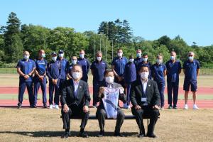 歓迎セレモニーでは、市長からフランス選手団の皆さんへ歓迎の挨拶を行い、江別の特産品の詰め合わせをプレゼントしました。フランス選手団からはチームを代表してチームを統括するジャン・セバスチャン氏からキャンプの受入れについて感謝の挨拶とユニフォームのプレゼントがありました。