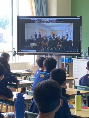 中央中学校と大麻中学校の教室とフランス選手団が宿泊するホテルを繋ぎ、オンライン交流を図りました。